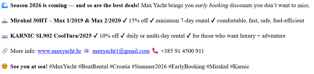 In our MAX Yacht Sukošan fleet there are 2 ships, Mirakul 30 HT, Max 1 and Max 2